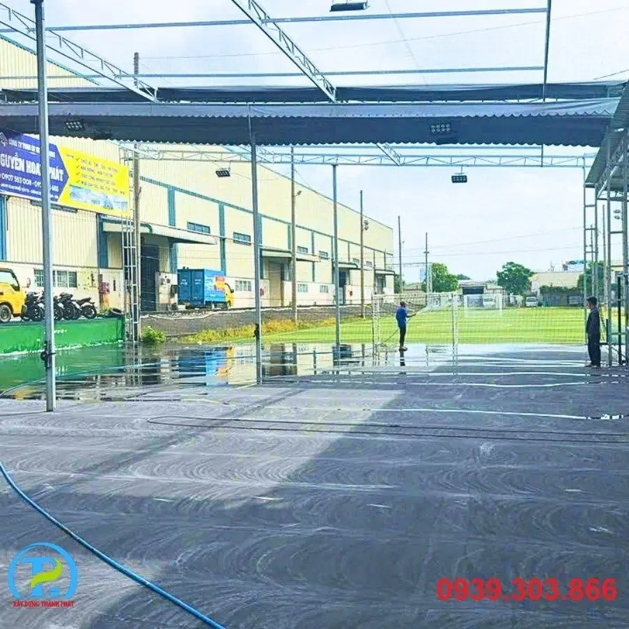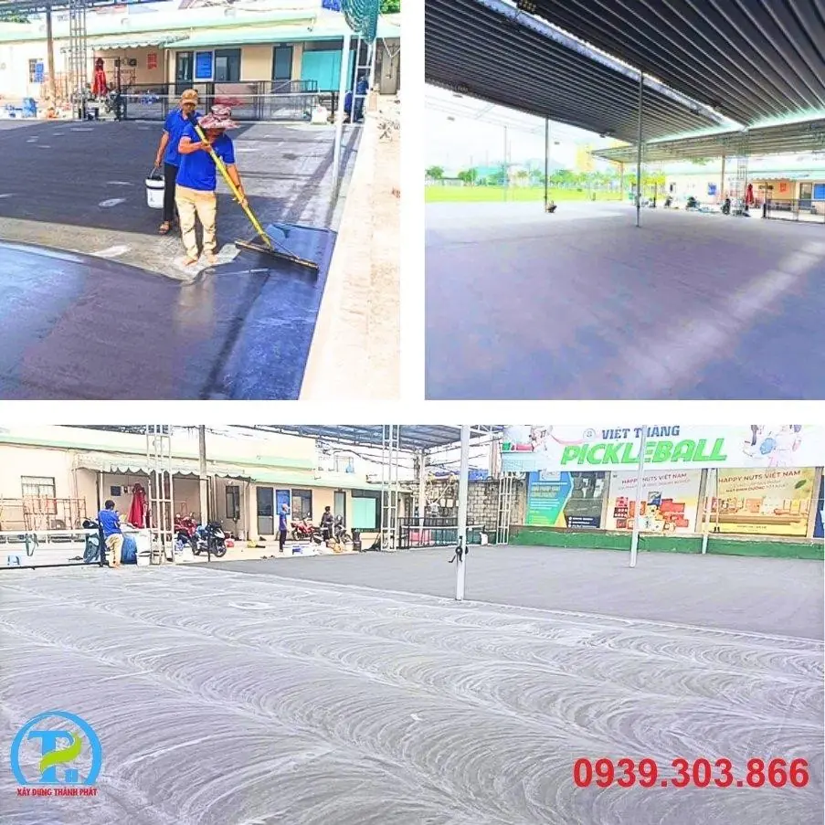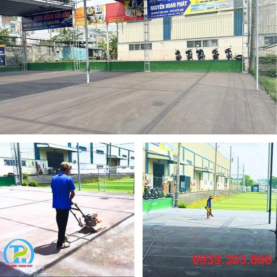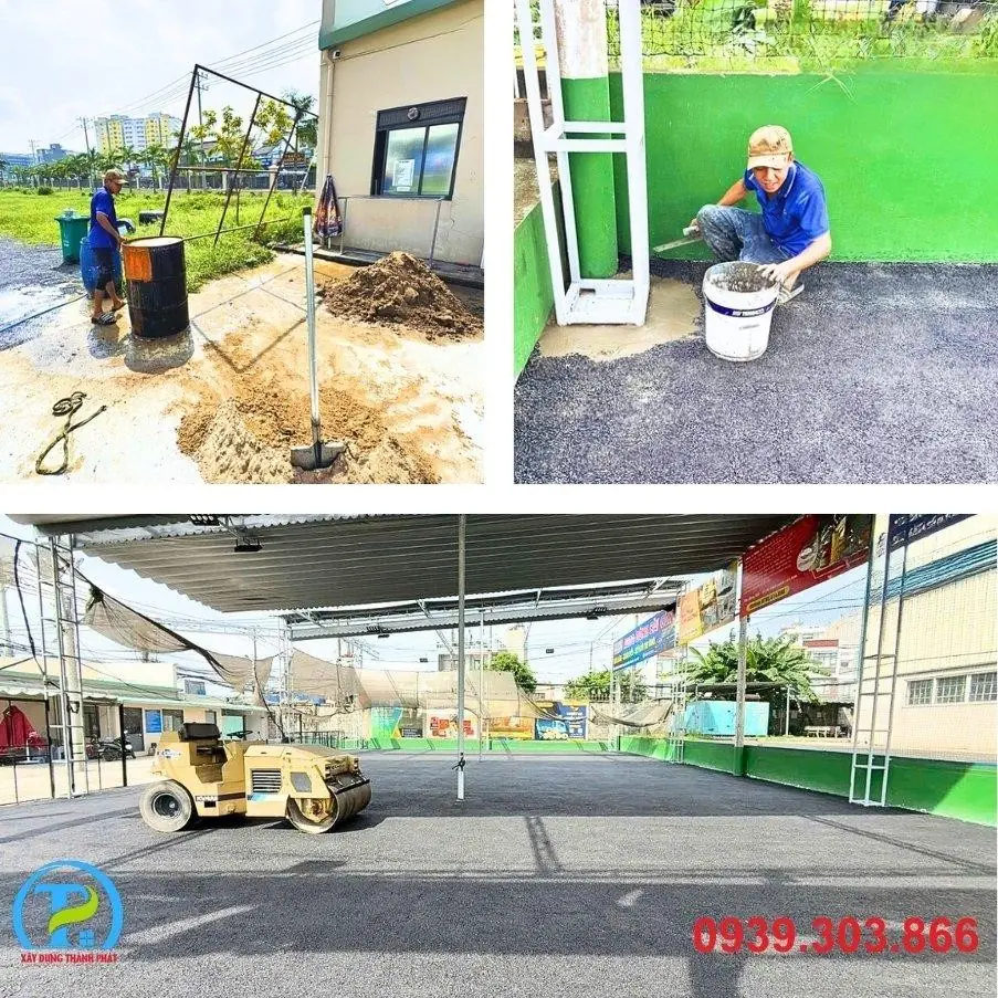 - Xử lý nền móng: Thực hiện công tác san lấp, đầm nén, và đổ bê tông/asphalt nền móng với độ dốc thoát nước tiêu chuẩn (0.5% - 1%). Đây là bước nền tảng quyết định tuổi thọ và độ phẳng của sân.
