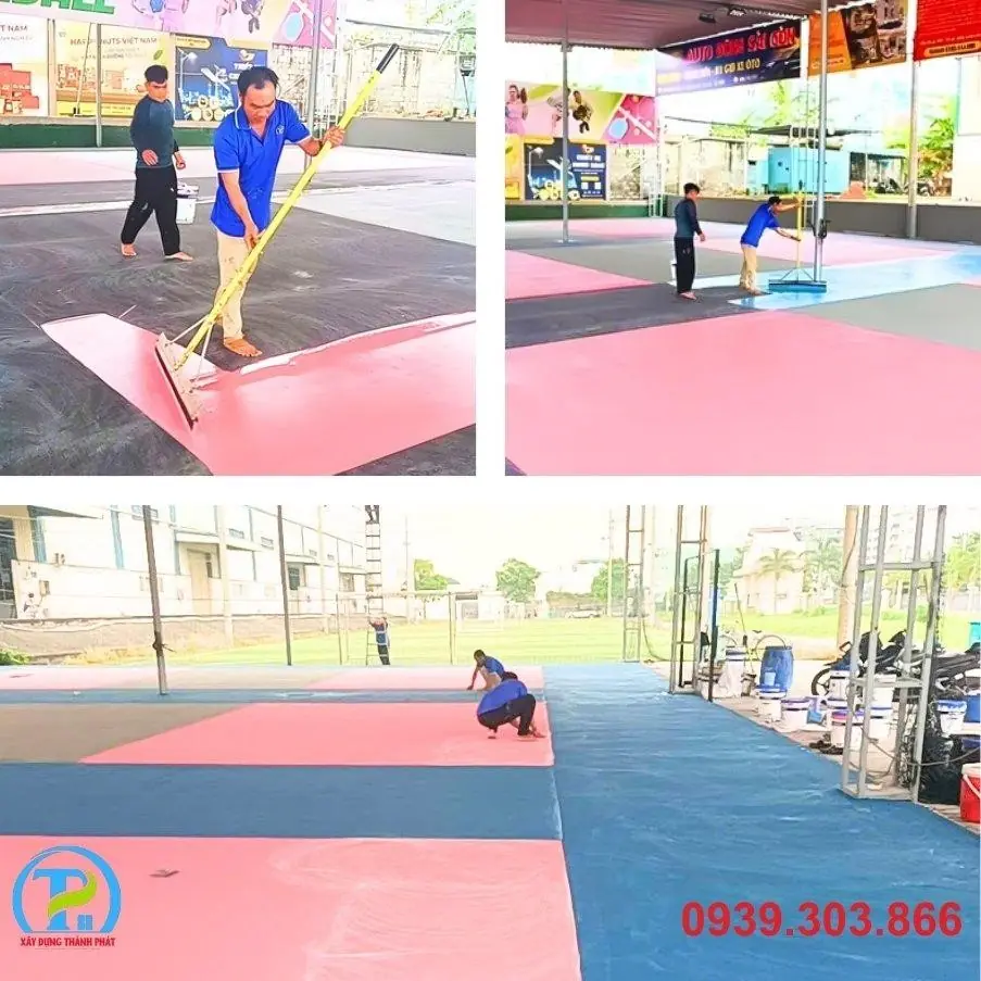 - Thi công lớp phủ kỹ thuật: Tiến hành thi công các lớp sơn chuyên dụng. Quy trình này bao gồm lớp đệm (cushion layer - nếu có), lớp màu chính và lớp hoàn thiện chống tia UV. Kỹ thuật viên đảm bảo độ dày lớp sơn đồng đều, đạt chuẩn ma sát để tối ưu hóa trải nghiệm chơi.