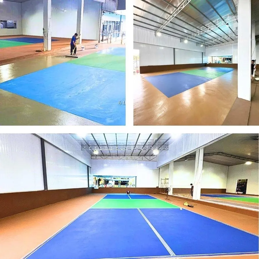 - Hệ Thống sơn chuyên dụng: Áp dụng nhiều lớp sơn Acrylic chuyên biệt, bao gồm lớp lót chống thấm, các lớp đệm giảm chấn thương, và lớp sơn hoàn thiện chống trượt, bền màu, chịu được thời tiết.