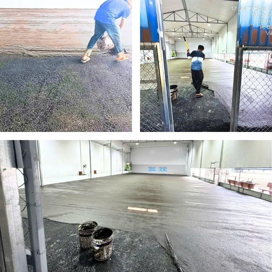- Xây dựng kết cấu sân: Thi công lớp nền bê tông hoặc asphalt chuyên dụng, tập trung vào độ phẳng tuyệt đối. Thực hiện xử lý chống nứt và làm phẳng bề mặt kỹ lưỡng.