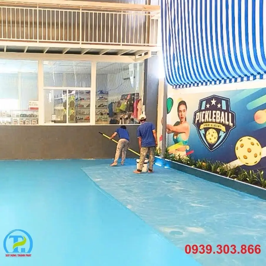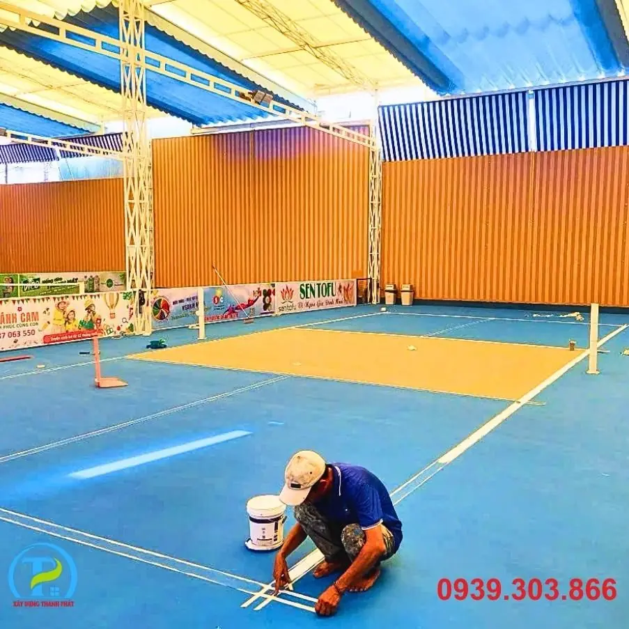 - Lớp màu hoàn thiện: Thi công nhiều lớp sơn Acrylic chuyên dụng cho sân thể thao, đảm bảo độ bền màu, chống trơn trượt và đạt chuẩn thi đấu quốc tế.