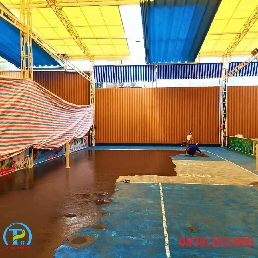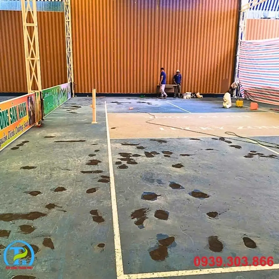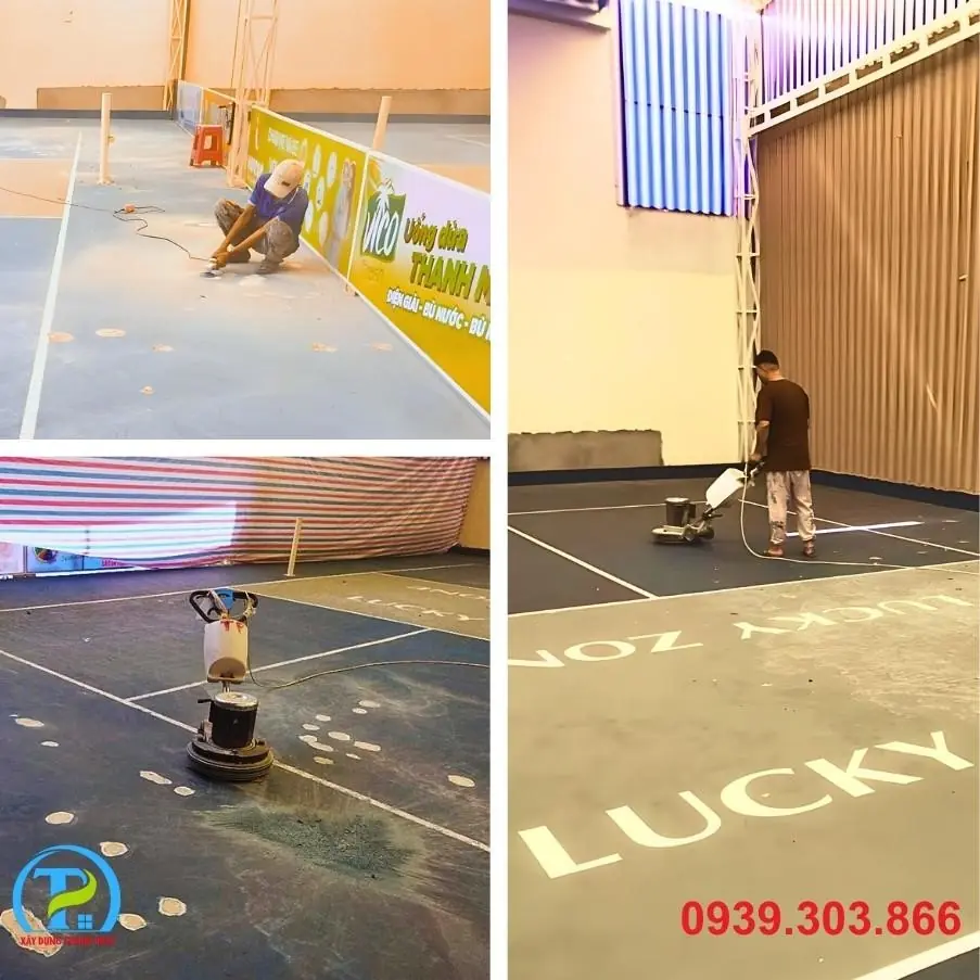 - Xử lý nền: Tiến hành mài, vá, và làm sạch toàn bộ bề mặt hiện có. Đảm bảo mặt nền đạt độ phẳng và độ dốc tiêu chuẩn để thoát nước tốt, tránh đọng nước trên sân.