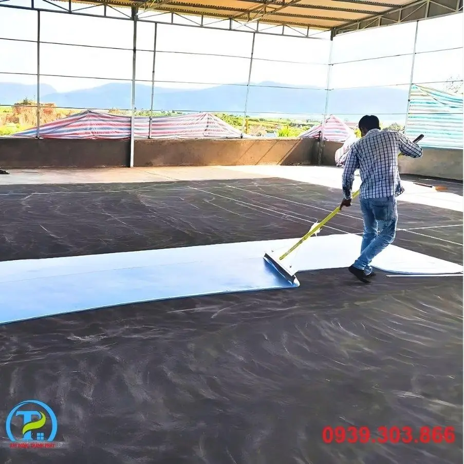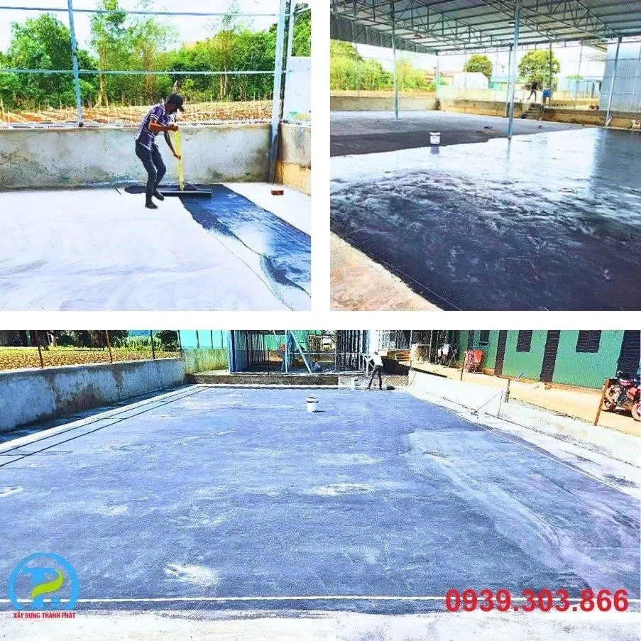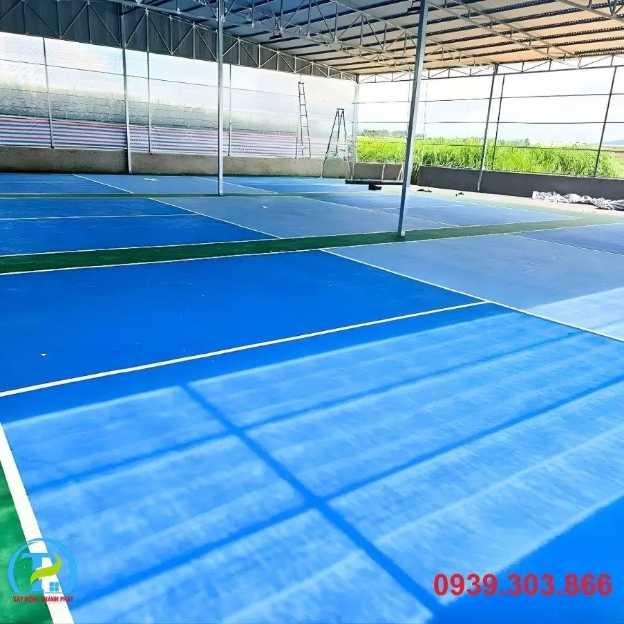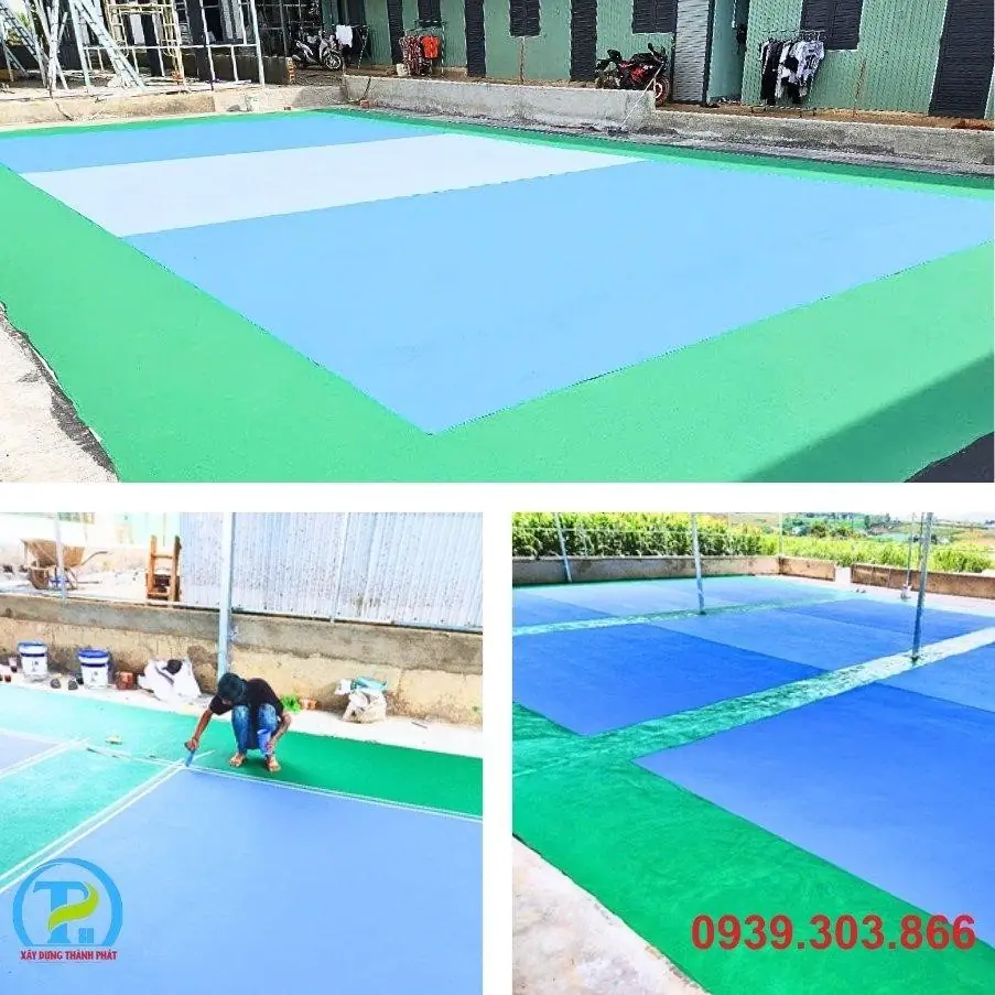 Tiến hành phủ lớp chống thấm lên bề mặt bê tông. Sau đó là các lớp đệm Acrylic chuyên dụng để tạo độ đàn hồi, giảm chấn thương và tối ưu hóa độ nảy bóng.